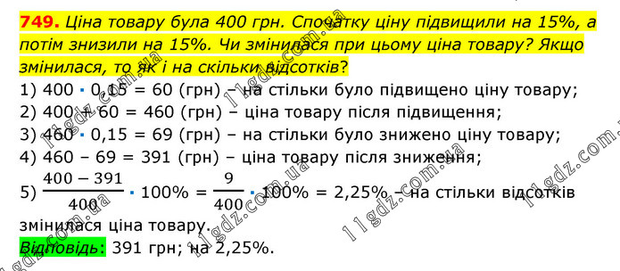 Ціна товару була 400 грн. Спочатку ціну підвищили на 15%, а потім знизили на 15%. Чи змінилася при цьому ціна товару? Якщо змінилася, то як і на скільки відсотків? 1) 400 · 0,15 = 60 (грн) – на стільки було підвищено ціну товару; 2) 400 + 60 = 460 (грн) – ціна товару після підвищення; 3) 460 · 0,15 = 69 (грн) – на стільки було знижено ціну товару; 4) 460 – 69 = 391 (грн) – ціна товару після зниження; 5) (400 - 391)/400 · 100% = 9/400 · 100% = 2,25% – на стільки відсотків змінилася ціна товару. Відповідь: 391 грн; на 2,25%.