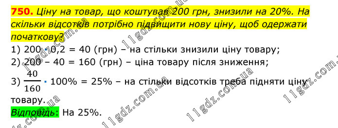 Ціну на товар, що коштував 200 грн, знизили на 20%. На скільки відсотків потрібно підвищити нову ціну, щоб одержати початкову? 1) 200 · 0,2 = 40 (грн) – на стільки знизили ціну товару; 2) 200 – 40 = 160 (грн) – ціна товару після зниження; 3) 40/160 · 100% = 25% – на стільки відсотків треба підняти ціну товару. Відповідь: На 25%.