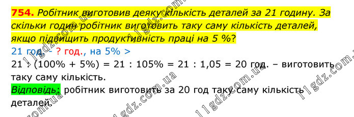 Робітник виготовив деяку кількість деталей за 21 годину. За скільки годин робітник виготовить таку саму кількість деталей, якщо підвищить продуктивність праці на 5 %? 21 год. - ? год., на 5% > 21 : (100% + 5%) = 21 : 105% = 21 : 1,05 = 20 год. – виготовить таку саму кількість. Відповідь: робітник виготовить за 20 год таку саму кількість деталей.