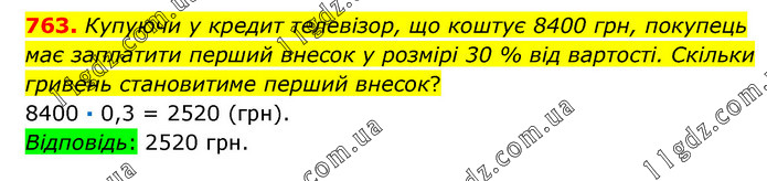 Купуючи у кредит телевізор, що коштує 8400 грн, покупець має заплатити перший внесок у розмірі 30 % від вартості. Скільки гривень становитиме перший внесок? 8400 · 0,3 = 2520 (грн). Відповідь: 2520 грн.