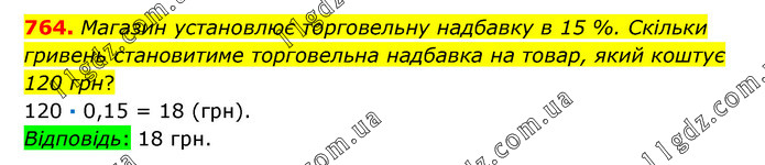 Магазин установлює торговельну надбавку в 15 %. Скільки гривень становитиме торговельна надбавка на товар, який коштує 120 грн? 120 · 0,15 = 18 (грн). Відповідь: 18 грн.