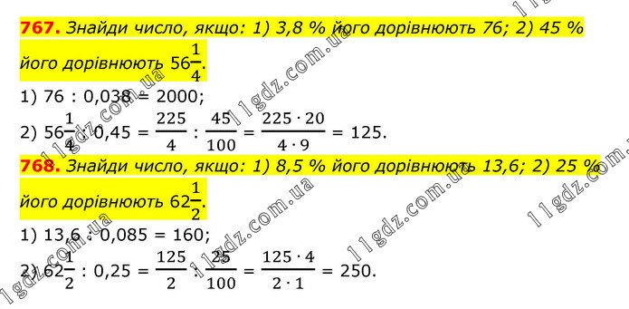 767. Знайди число, якщо: 1) 3,8 % його дорівнюють 76; 2) 45 % його дорівнюють 561/4. 1) 76 : 0,038 = 2000; 2) 561/4 : 0,45 = 225/4 : 45/100 = (225 ∙ 20)/(4 ∙ 9) = 125. 768. Знайди число, якщо: 1) 8,5 % його дорівнюють 13,6; 2) 25 % його дорівнюють 621/2. 1) 13,6 : 0,085 = 160; 2) 621/2 : 0,25 = 125/2 : 25/100 = (125 ∙ 4)/(2 ∙ 1) = 250.