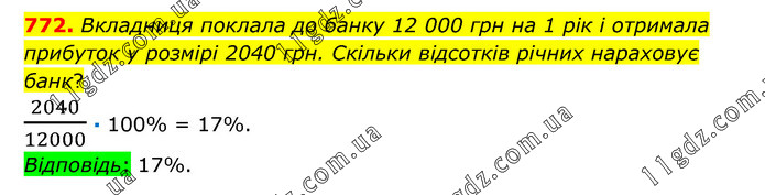 Вкладниця поклала до банку 12 000 грн на 1 рік і отримала прибуток у розмірі 2040 грн. Скільки відсотків річних нараховує банк? 2040/12000 · 100% = 17%. Відповідь: 17%.