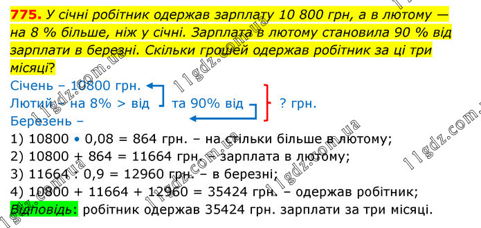 У січні робітник одержав зарплату 10 800 грн, а в лютому — на 8 % більше, ніж у січні. Зарплата в лютому становила 90 % від зарплати в березні. Скільки грошей одержав робітник за ці три місяці? Січень – 10800 грн. Лютий – на 8% > від та 90% від ? грн. Березень – 1) 10800 • 0,08 = 864 грн. – на стільки більше в лютому; 2) 10800 + 864 = 11664 грн. – зарплата в лютому; 3) 11664 : 0,9 = 12960 грн. – в березні; 4) 10800 + 11664 + 12960 = 35424 грн. – одержав робітник; Відповідь: робітник одержав 35424 грн. зарплати за три місяці.