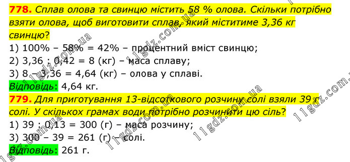 778. Сплав олова та свинцю містить 58 % олова. Скільки потрібно взяти олова, щоб виготовити сплав, який міститиме 3,36 кг свинцю? 1) 100% – 58% = 42% – процентний вміст свинцю; 2) 3,36 : 0,42 = 8 (кг) – маса сплаву; 3) 8 – 3,36 = 4,64 (кг) – олова у сплаві. Відповідь: 4,64 кг. 779. Для приготування 13-відсоткового розчину солі взяли 39 г солі. У скількох грамах води потрібно розчинити цю сіль? 1) 39 : 0,13 = 300 (г) – маса розчину; 3) 300 – 39 = 261 (г) – солі. Відповідь: 261 г.