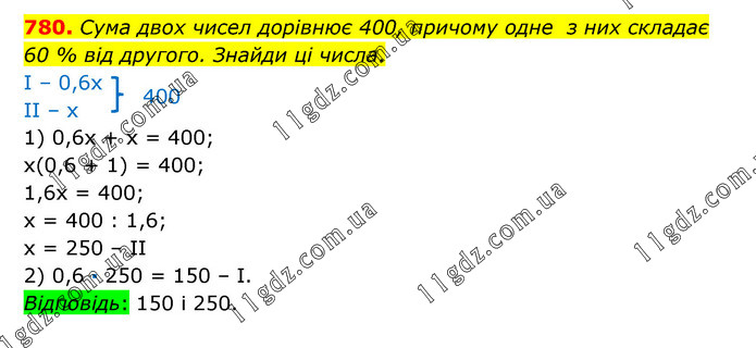 Сума двох чисел дорівнює 400, причому одне з них складає 60 % від другого. Знайди ці числа. І – 0,6х ІІ – х 1) 0,6х + х = 400; х(0,6 + 1) = 400; 1,6х = 400; х = 400 : 1,6; х = 250 – ІІ 2) 0,6 · 250 = 150 – І. Відповідь: 150 і 250.