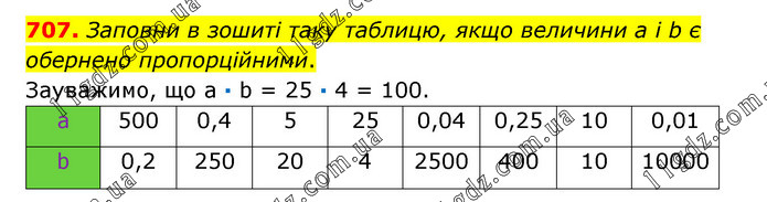 Заповни в зошиті таку таблицю, якщо величини а і b є обернено пропорційними. Зауважимо, що а · b = 25 · 4 = 100.