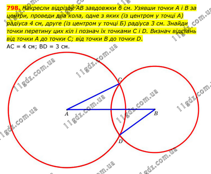 Накресли відрізок AB завдовжки 6 см. Узявши точки А і В за центри, проведи два кола, одне з яких (із центром у точці А) радіуса 4 см, друге (із центром у точці Б) радіуса 3 см. Знайди точки перетину цих кіл і познач їх точками C і D. Визнач відстань від точки А до точки С; від точки В до точки D. АС = 4 см; BD = 3 см.