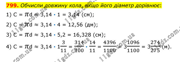 Обчисли довжину кола, якщо його діаметр дорівнює: 1) С = πd ≈ 3,14 · 1 = 3,14 (см); 2) С = πd ≈ 3,14 · 4 = 12,56 (дм); 3) С = πd ≈ 3,14 · 5,2 = 16,328 (см); 4) С = πd ≈ 3,14 · 13/11 = 314/100 · 14/11 = 4396/1100 = 31096/1100 = 3274/275 (м).