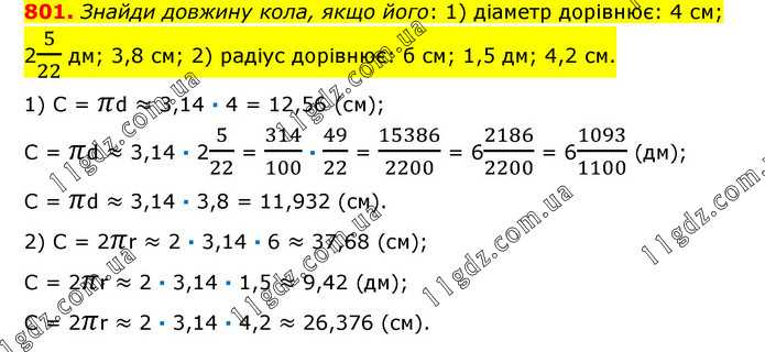 Знайди довжину кола, якщо його: 1) діаметр дорівнює: 4 см; 25/22 дм; 3,8 см; 2) радіус дорівнює: б см; 1,5 дм; 4,2 см. 1) С = πd ≈ 3,14 · 4 = 12,56 (см); С = πd ≈ 3,14 · 25/22 = 314/100 · 49/22 = 15386/2200 = 62186/2200 = 61093/1100 (дм); С = πd ≈ 3,14 · 3,8 = 11,932 (см). 2) С = 2πr ≈ 2 · 3,14 · 6 ≈ 37,68 (см); С = 2πr ≈ 2 · 3,14 · 1,5 ≈ 9,42 (дм); С = 2πr ≈ 2 · 3,14 · 4,2 ≈ 26,376 (см).