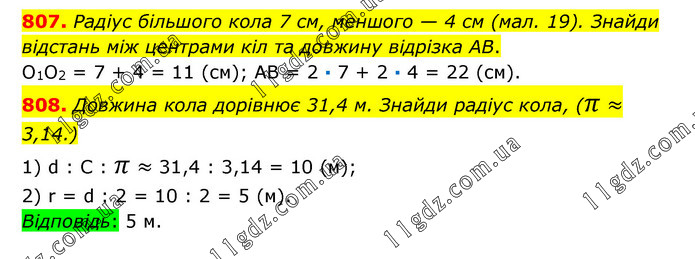 807. Радіус більшого кола 7 см, меншого — 4 см (мал. 19). Знайди відстань між центрами кіл та довжину відрізка AB. О1О2 = 7 + 4 = 11 (см); АВ = 2 · 7 + 2 · 4 = 22 (см). 808. Довжина кола дорівнює 31,4 м. Знайди радіус кола, (π ≈ 3,14.) 1) d : C : π ≈ 31,4 : 3,14 = 10 (м); 2) r = d : 2 = 10 : 2 = 5 (м). Відповідь: 5 м.