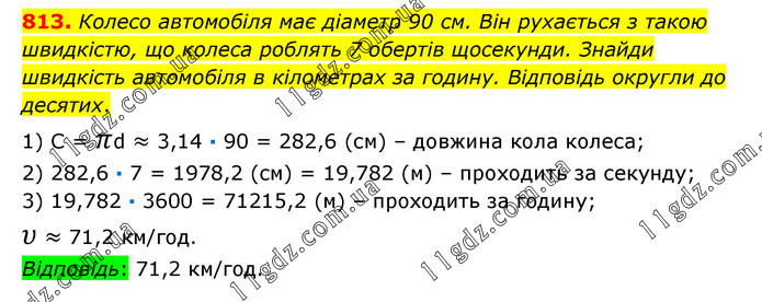 Колесо автомобіля має діаметр 90 см. Він рухається з такою швидкістю, що колеса роблять 7 обертів щосекунди. Знайди швидкість автомобіля в кілометрах за годину. Відповідь округли до десятих. 1) С = πd ≈ 3,14 · 90 = 282,6 (см) – довжина кола колеса; 2) 282,6 · 7 = 1978,2 (см) = 19,782 (м) – проходить за секунду; 3) 19,782 · 3600 = 71215,2 (м) – проходить за годину; υ ≈ 71,2 км/год. Відповідь: 71,2 км/год.
