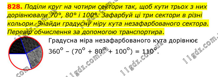 Поділи круг на чотири сектори так, щоб кути трьох з них дорівнювали 70°, 80° і 100°. Зафарбуй ці три сектори в різні кольори. Знайди градусну міру кута незафарбованого сектора. Перевір обчислення за допомогою транспортира. Градусна міра незафарбованого кута дорівнює 360° – (70° + 80° + 100°) = 110°.