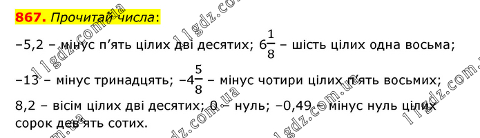 Прочитай числа: –5,2 – мінус п’ять цілих дві десятих; 61/8 – шість цілих одна восьма; –13 – мінус тринадцять; –45/8 – мінус чотири цілих п’ять восьмих; 8,2 – вісім цілих дві десятих; 0 – нуль; –0,49 – мінус нуль цілих сорок дев’ять сотих.