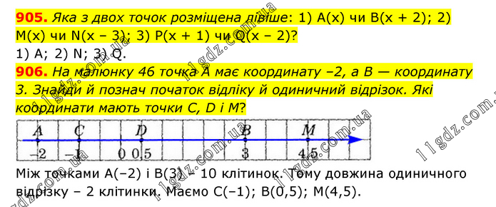 905. Яка з двох точок розміщена лівіше: 1) А(х) чи В(х + 2); 2) М(х) чи N(x – 3); 3) Р(х + 1) чи Q(x – 2)? 1) А; 2) N; 3) Q. 906. На малюнку 46 точка А має координату –2, а В — координату 3. Знайди й познач початок відліку й одиничний відрізок. Які координати мають точки С, D і M? Між точками А(–2) і В(3) – 10 клітинок. Тому довжина одиничного відрізку – 2 клітинки. Маємо С(–1); В(0,5); М(4,5).