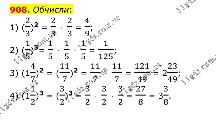 Обчисли: 1) (2/3)2 = 2/3 · 2/3 = 4/9; 2) (1/5)3= 1/5 · 1/5 · 1/5 = 1/125; 3) (14/7)2 = (11/7)2 = 11/7 · 11/7 = 121/49 = 223/49; 4) (11/2)3 = (3/2)3 = 3/2 · 3/2 · 3/2 = 27/8 = 33/8.