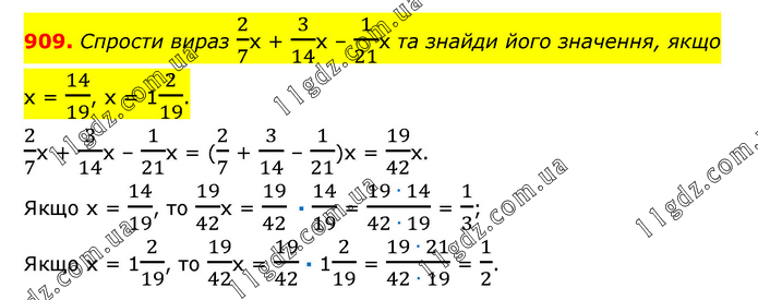 Спрости вираз 2/7х + 3/14х – 1/21х та знайди його значення, якщо х = 14/19, х = 12/19. 2/7х + 3/14х – 1/21х = (2/7 + 3/14 – 1/21)х = 19/42х. Якщо х = 14/19, то 19/42х = 19/42 · 14/19 = (19 ∙ 14)/(42 ∙ 19) = 1/3; Якщо х = 12/19, то 19/42х = 19/42 · 12/19 = (19 ∙ 21)/(42 ∙ 19) = 1/2.