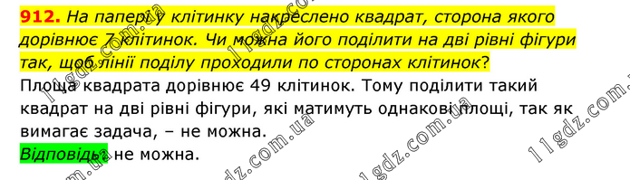 На папері у клітинку накреслено квадрат, сторона якого дорівнює 7 клітинок. Чи можна його поділити на дві рівні фігури так, щоб лінії поділу проходили по сторонах клітинок? Площа квадрата дорівнює 49 клітинок. Тому поділити такий квадрат на дві рівні фігури, які матимуть однакові площі, так як вимагає задача, – не можна. Відповідь: не можна.