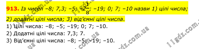 Із чисел –8; 7,3; –5; –21/8; –19; 0; 7; –10 назви 1) цілі числа; 2) додатні цілі числа; 3) від’ємні цілі числа. 1) Цілі числа: –8; –5; –19; 0; 7; –10. 2) Додатні цілі числа: 7,3; 7. 3) Від’ємні цілі числа: –8; –5; –19; –10.