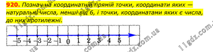 Познач на координатній прямій точки, координати яких — натуральні числа, менші від 6, і точки, координатами яких є числа, до них протилежні.