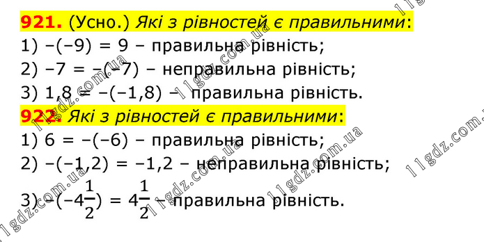 921. (Усно.) Які з рівностей є правильними: 1) –(–9) = 9 – правильна рівність; 2) –7 = –(–7) – неправильна рівність; 3) 1,8 = –(–1,8) – правильна рівність. 922. Які з рівностей є правильними: 1) 6 = –(–6) – правильна рівність; 2) –(–1,2) = –1,2 – неправильна рівність; 3) –(–41/2) = 41/2 – правильна рівність.