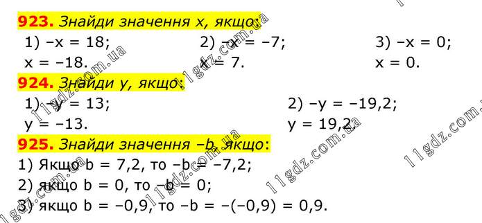 923. Знайди значення х, якщо: 1) –х = 18; х = –18. 2) –х = –7; х = 7. 3) –х = 0; х = 0. 924. Знайди у, якщо: 1) –у = 13; у = –13. 2) –у = –19,2; у = 19,2. 925. Знайди значення –b, якщо: 1) Якщо b = 7,2, то –b = –7,2; 2) якщо b = 0, то –b = 0; 3) якщо b = –0,9, то –b = –(–0,9) = 0,9.
