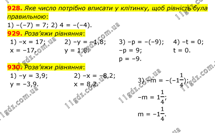 928. Яке число потрібно вписати у клітинку, щоб рівність була правильною: 1) –(–7) = 7; 2) 4 = –(–4). 929. Розв’яжи рівняння: 1) –x = 17; x = –17. 2) –y = –1,8; y = 1,8. 3) –p = –(–9); –p = 9; p = –9. 4) –t = 0; t = 0. 930. Розв’яжи рівняння: 1) –y = 3,9; y = –3,9. 2) –х = –8,2; х = 8,2. 3) –m = –(–11/4); –m = 11/4; m = –11/4.