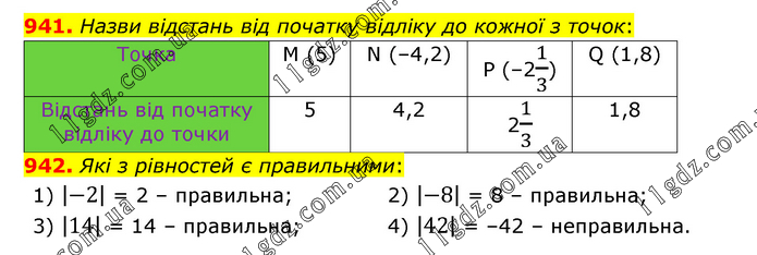 942. Які з рівностей є правильними: 1) |-2| = 2 – правильна; 2) |-8| = 8 – правильна; 3) |14| = 14 – правильна; 4) |42| = –42 – неправильна.