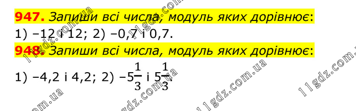 947. Запиши всі числа, модуль яких дорівнює: 1) –12 і 12; 2) –0,7 і 0,7. 948. Запиши всі числа, модуль яких дорівнює: 1) –4,2 і 4,2; 2) –51/3 і 51/3.