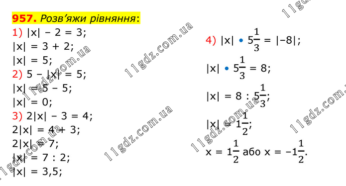 Розв’яжи рівняння: 1) |х| – 2 = 3; |х| = 3 + 2; |х| = 5; 2) 5 – |х| = 5; |х| = 5 – 5; |х| = 0; 3) 2|х| – 3 = 4; 2|х| = 4 + 3; 2|х| = 7; |х| = 7 : 2; |х| = 3,5; 4) |х| • 51/3 = |–8|; |х| • 51/3 = 8; |х| = 8 : 51/3; |х| = 11/2; х = 11/2 або х = –11/2.