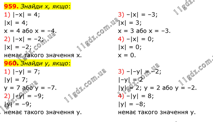 959. Знайди х, якщо: 1) |–х| = 4; |х| = 4; х = 4 або х = –4. 2) |–х| = –2; |х| = –2; немає такого значення х. 3) –|х| = –3; |х| = 3; х = 3 або х = –3. 4) –|х| = 0; |х| = 0; х = 0. 960. Знайди у, якщо: 1) |–у| = 7; |у| = 7; у = 7 або у = –7. 2) |–у| = –9; |у| = –9; немає такого значення у. 3) –|–у| = –2; |–у| = 2 |y| = 2; y = 2 або у = –2. 4) –|у| = 8; |у| = –8; немає такого значення у.