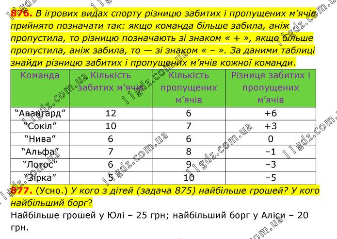 876. В ігрових видах спорту різницю забитих і пропущених м’ячів прийнято позначати так: якщо команда більше забила, аніж пропустила, то різницю позначають зі знаком « + », якщо більше пропустила, аніж забила, то — зі знаком « – ». За даними таблиці знайди різницю забитих і пропущених м’ячів кожної команди. 877. (Усно.) У кого з дітей (задача 875) найбільше грошей? У кого найбільший борг? Найбільше грошей у Юлі – 25 грн; найбільший борг у Аліси – 20 грн.