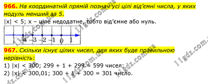 966. На координатній прямій познач усі цілі від’ємні числа, у яких модуль менший за 5. |х| < 5; х – ціле недодатне, тобто від’ємне або нуль. 967. Скільки існує цілих чисел, для яких буде правильною нерівність: 1) |х| < 300; 299 + 1 + 299 = 599 чисел; 2) |х| < 300,01; 300 + 1 + 300 = 301 число.