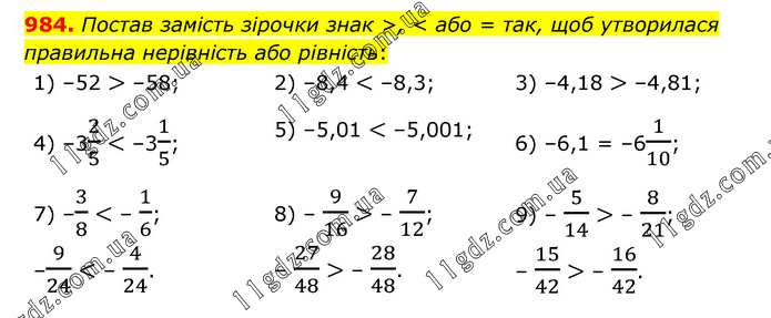 Постав замість зірочки знак >, < або = так, щоб утворилася правильна нерівність або рівність: 1) –52 > –58; 2) –8,4 < –8,3; 3) –4,18 > –4,81; 4) –32/5 < –31/5; 5) –5,01 < –5,001; 6) –6,1 = –61/10; 7) –3/8 < – 1/6; –9/24 < – 4/24. 8) – 9/16 > – 7/12; – 27/48 > – 28/48. 9) – 5/14 > – 8/21; – 15/42 > – 16/42.