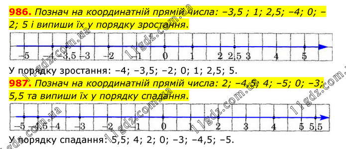 986. Познач на координатній прямій числа: –3,5 ; 1; 2,5; –4; 0; –2; 5 і випиши їх у порядку зростання. У порядку зростання: –4; –3,5; –2; 0; 1; 2,5; 5. 987. Познач на координатній прямій числа: 2; –4,5; 4; –5; 0; –3; 5,5 та випиши їх у порядку спадання. У порядку спадання: 5,5; 4; 2; 0; –3; –4,5; –5.
