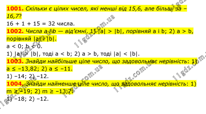 1001. Скільки є цілих чисел, які менші від 15,6, але більші за –16,7? 16 + 1 + 15 = 32 числа. 1002. Числа а і b — від’ємні. 1) |а| > |b|, порівняй а і b; 2) а > b, порівняй |а| і |b|. а < 0; b < 0. 1) |а| > |b|, тоді а < b; 2) а > b, тоді |а| < |b|. 1003. Знайди найбільше ціле число, що задовольняє нерівність: 1) а ≤ –13,82; 2) а ≤ –11. 1) –14; 2) –12. 1004. Знайди найменше ціле число, що задовольняє нерівність: 1) m ≥ –19; 2) m ≥ –13,7. 1) –18; 2) –12.