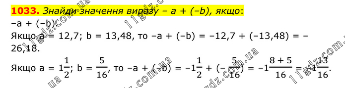 Знайди значення виразу – а + (–b), якщо: –а + (–b). Якщо а = 12,7; b = 13,48, то –а + (–b) = –12,7 + (–13,48) = –26,18. Якщо а = 11/2; b = 5/16, то –а + (–b) = –11/2 + (– 5/16) = –1(8 + 5)/16 = –113/16.