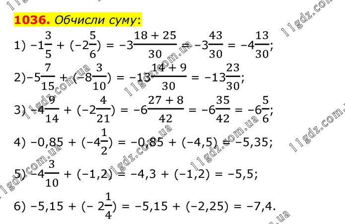 Обчисли суму: 1) –13/5 + (–25/6) = –3(18 + 25)/30 = –343/30 = –413/30; 2)–57/15 + (–83/10) = –13(14 + 9)/30 = –1323/30; 3) –49/14 + (–24/21) = –6(27 + 8)/42 = –635/42 = –65/6; 4) –0,85 + (–41/2) = –0,85 + (–4,5) = –5,35; 5) –43/10 + (–1,2) = –4,3 + (–1,2) = –5,5; 6) –5,15 + (– 21/4) = –5,15 + (–2,25) = –7,4.