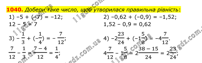 Добери таке число, щоб утворилася правильна рівність: 1) –5 + (–7) = –12; 12 – 5 = 7 2) –0,62 + (–0,9) = –1,52; 1,52 – 0,9 = 0,62 3) – 1/3 + (–1/4) = – 7/12; 7/12 – 1/3 = (7 - 4)/12 = 1/4; 4) –223/24 + (–15/8) = –47/12. 47/12 – 15/8 = 2(38 - 15)/24 = 223/24;