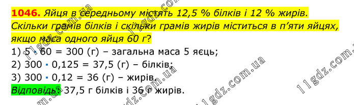 Яйця в середньому містять 12,5 % білків і 12 % жирів. Скільки грамів білків і скільки грамів жирів міститься в п’яти яйцях, якщо маса одного яйця 60 г? 1) 5 · 60 = 300 (г) – загальна маса 5 яєць; 2) 300 · 0,125 = 37,5 (г) – білків; 3) 300 · 0,12 = 36 (г) – жирів. Відповідь: 37,5 г білків і 36 г жирів.