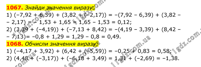 1067. Знайди значення виразу: 1) (–7,92 + 6,39) + (3,82 + (–2,17)) = –(7,92 – 6,39) + (3,82 – – 2,17) = – 1,53 + 1,65 = 1,65 – 1,53 = 0,12; 2) (3,39 + (–4,19)) + (–7,13 + 8,42) = –(4,19 – 3,39) + (8,42 – – 7,13)= –0,8 + 1,29 = 1,29 – 0,8 = 0,49. 1068. Обчисли значення виразу: 1) (–4,17 + 3,92) + (6,42 + (–5,59)) = –0,25 + 0,83 = 0,58; 2) (4,48 + (–3,17)) + (–6,18 + 3,49) = 1,31 + (–2,69) = –1,38.