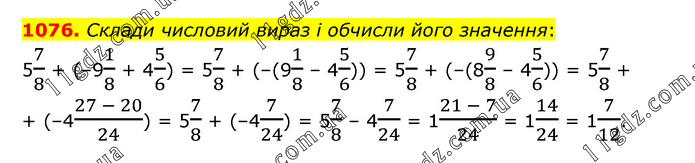 Склади числовий вираз і обчисли його значення: 57/8 + (–91/8 + 45/6) = 57/8 + (–(91/8 – 45/6)) = 57/8 + (–(89/8 – 45/6)) = 57/8 + + (–4(27 - 20)/24) = 57/8 + (–47/24) = 57/8 – 47/24 = 1(21 - 7)/24 = 114/24 = 17/12.
