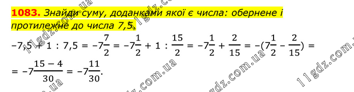 Знайди суму, доданками якої є числа: обернене і протилежне до числа 7,5. –7,5 + 1 : 7,5 = –77/2 = –71/2 + 1 : 15/2 = –71/2 + 2/15 = –(71/2 – 2/15) = = –7(15 - 4)/30 = –711/30.