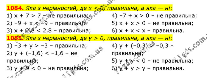 1084. Яка з нерівностей, де х < 0, правильна, а яка — ні: 1) х + 7 > 7 – не правильна; 2) –9 + х < –9 – правильні; 3) х + 2,8 < 2,8 – правильна; 4) –7 + х > 0 – не правильна; 5) х + х > 0 – не правильна; 6) х + х < х – правильна. 1085. Яка з нерівностей, де у > 0, правильна, а яка — ні: 1) –3 + у > –3 – правильна; 2) у + (–1,6) < –1,6 – не правильна; 3) у + 9 < 0 – не правильна; 4) у + (–0,3) > –0,3 – правильна; 5) у + у < 0 – не правильна; 6) у + у > у – правильна.