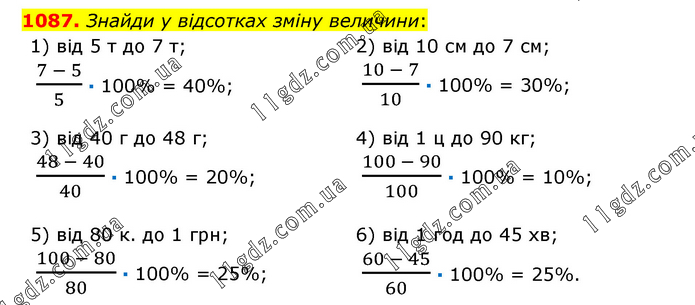 Знайди у відсотках зміну величини: 1) від 5 т до 7 т; (7 - 5)/5 · 100% = 40%; 2) від 10 см до 7 см; (10 - 7)/10 · 100% = 30%; 3) від 40 г до 48 г; (48 - 40)/40 · 100% = 20%; 4) від 1 ц до 90 кг; (100 - 90)/100 · 100% = 10%; 5) від 80 к. до 1 грн; (100 - 80)/80 · 100% = 25%; 6) від 1 год до 45 хв; (60 - 45)/60 · 100% = 25%.