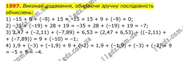 Виконай додавання, обираючи зручну послідовність обчислень: 1) –15 + 9 + (–9) + 15 = –15 + 15 + 9 + (–9) = 0; 2) –35 + (–19) + 28 + 19 = –35 + 28 + (–19) + 19 = –7; 3) 2,47 + (–2,11) + (–7,89) + 6,53 = (2,47 + 6,53) + ((–2,11) + + (–7,89)) = 9 + (–10) = –1; 4) 1,9 + (–3) + (–1,9) + 9 + (–2) = 1,9 + (–1,9) + (–3) + (–2) + 9 = –5 + 9 = –4.