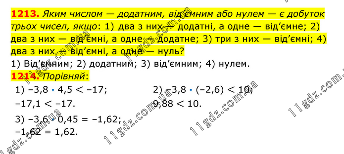1213. Яким числом — додатним, від’ємним або нулем — є добуток трьох чисел, якщо: 1) два з них — додатні, а одне — від’ємне; 2) два з них — від’ємні, а одне — додатне; 3) три з них — від’ємні; 4) два з них — від’ємні, а одне — нуль? 1) Від’ємним; 2) додатним; 3) від’ємним; 4) нулем. 1214. Порівняй: 1) –3,8 · 4,5 < –17; –17,1 < –17. 2) –3,8 · (–2,6) < 10; 9,88 < 10. 3) –3,6 · 0,45 = –1,62; –1,62 = 1,62.