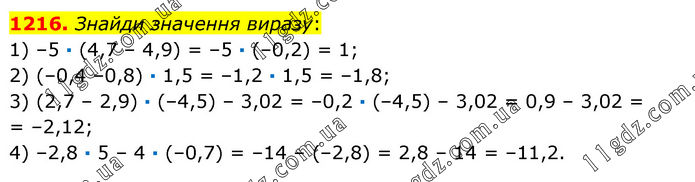 Знайди значення виразу: 1) –5 · (4,7 – 4,9) = –5 · (–0,2) = 1; 2) (–0,4 –0,8) · 1,5 = –1,2 · 1,5 = –1,8; 3) (2,7 – 2,9) · (–4,5) – 3,02 = –0,2 · (–4,5) – 3,02 = 0,9 – 3,02 = = –2,12; 4) –2,8 · 5 – 4 · (–0,7) = –14 – (–2,8) = 2,8 – 14 = –11,2.