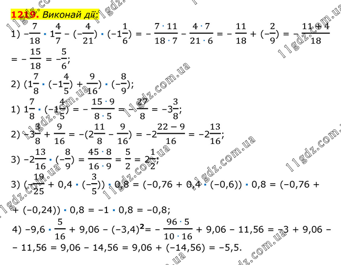 Виконай дії: 1) –7/18 · 14/7 – (–4/21) · (–11/6) = – (7 ∙ 11)/(18 ∙ 7) – (4 ∙ 7)/(21 ∙ 6) = – 11/18 + (–2/9) = – (11 + 4)/18 = – 15/18 = –5/6; 2) (17/8 · (–14/5) + 9/16) · (–8/9); 1) 17/8 · (–14/5) = – (15 ∙ 9)/(8 ∙ 5) = – 27/8 = –33/8; 2) –33/8 + 9/16 = –(211/8 – 9/16) = –2(22 - 9)/16 = –213/16; 3) –213/16 · (–8/9) = (45 ∙ 8)/(16 ∙ 9) = 5/2 = 21/2; 3) (–19/25 + 0,4 · (–3/5)) · 0,8 = (–0,76 + 0,4 · (–0,6)) · 0,8 = (–0,76 + + (–0,24)) · 0,8 = –1 · 0,8 = –0,8; 4) –9,6 · 5/16 + 9,06 – (–3,4)2= – (96 ∙ 5)/(10 ∙ 16) + 9,06 – 11,56 = –3 + 9,06 – – 11,56 = 9,06 – 14,56 = 9,06 + (–14,56) = –5,5.