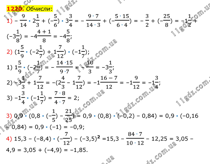 Обчисли: 1) – 9/14 · 21/3 + (–5/6) · 33/4 = – (9 ∙ 7)/(14 ∙ 3) + (–(5 ∙ 15)/(6 ∙ 4)) = – 3/2 + (–25/8) = –11/2 + (–31/8) = –4(4 + 1)/8 = –45/8; 2) (15/9 · (–21/7) + 17/12) · (–11/7); 1) 15/9 · (–21/7) = – (14 ∙15)/(9 ∙7) = – 10/3 = –31/3; 2) –31/3 + 17/12 = –(24/3 – 17/12) = –1(16 - 7)/12 = –19/12 = –13/4; 3) –13/4 · (–11/7) = (7 ∙ 8)/(4 ∙ 7) = 2; 3) 0,9 · (0,8 · (–1/5) – 21/25) = 0,9 · (0,8) · (–0,2) – 0,84) = 0,9 · (–0,16 – 0,84) = 0,9 · (–1) = –0,9; 4) 15,3 – (–8,4) · (–7/12) – (–3,5)2 =15,3 – (84 ∙ 7)/(10 ∙ 12) – 12,25 = 3,05 – 4,9 = 3,05 + (–4,9) = –1,85.